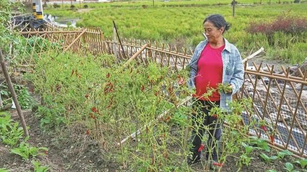 村民在自家小院中采摘辣椒