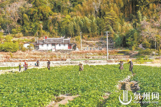 在德化县水口镇,当地村民在生机盎然的马铃薯田里耕作。