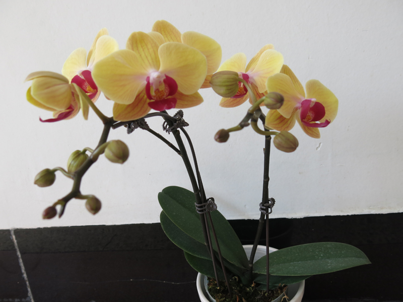 钜宝顽童:花径6cm,花梗高度28cm,叶片间距28cm,花色黄花红心,可双梗,苗株易栽培管理。