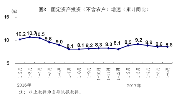 上半年,全国固定资产投资(不含农户)280605亿元,同比增长8.6%,增速比一季度回落0.6个百分点。其中,国有控股投资102022亿元,增长12.0%;民间投资170239亿元,增长7.2%,比1-5月份加快0.4个百分点,比上年同期加快4.4个百分点,占全部投资的比重为60.7%。分产业看,第一产业投资8694亿元,增长16.5%;第二产业投资105807亿元,增长4.0%,其中制造业投资86809亿元,增长5.5%,比1-5月份加快0.4个百分点,增速连续两个月回升,比上年同期加快2.2个百分点;第三产业投资166104亿元,增长11.3%。基础设施投资59422亿元,增长21.1%,比1-5月份加快0.2个百分点,比上年同期加快0.2个百分点。高技术产业投资快速增长,高技术制造业和高技术服务业投资同比分别增长21.5%和22.3%,分别快于全部投资12.9和13.7个百分点。固定资产投资到位资金286275亿元,同比增长1.4%,增速由负转正。新开工项目计划总投资237258亿元,同比下降1.2%,降幅比1-5月份收窄4.4个百分点。从环比看,6月份固定资产投资(不含农户)比上月增长0.73%。