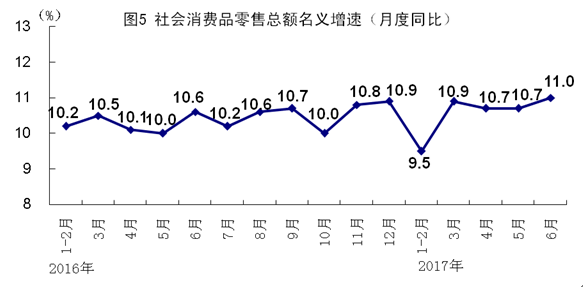 上半年,社会消费品零售总额172369亿元,同比增长10.4%,增速比一季度加快0.4个百分点,比上年同期加快0.1个百分点。其中,限额以上单位消费品零售额76953亿元,增长8.7%。按经营单位所在地分,城镇消费品零售额147786亿元,增长10.1%;乡村消费品零售额24583亿元,增长12.3%。按消费类型分,餐饮收入18546亿元,增长11.2%;商品零售153822亿元,增长10.3%,其中限额以上单位商品零售72420亿元,增长8.8%。消费升级类商品销售增长较快,文化办公用品增长11.8%,体育娱乐用品增长17.1%,家具增长13.4%,建筑及装潢材料增长13.9%。6月份,社会消费品零售总额同比增长11.0%,比上月加快0.3个百分点,环比增长0.93%。