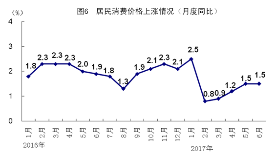 上半年,全国居民消费价格同比上涨1.4%,涨幅与一季度持平。其中,城市上涨1.5%,农村上涨1.0%。分类别看,食品烟酒价格同比下降0.8%,衣着上涨1.3%,居住上涨2.4%,生活用品及服务上涨0.8%,交通和通信上涨1.5%,教育文化和娱乐上涨2.5%,医疗保健上涨5.4%,其他用品和服务上涨3.3%。在食品烟酒价格中,粮食价格上涨1.4%,猪肉价格下降6.1%,鲜菜价格下降14.7%。6月份,全国居民消费价格同比上涨1.5%,涨幅与上月持平,环比下降0.2%。