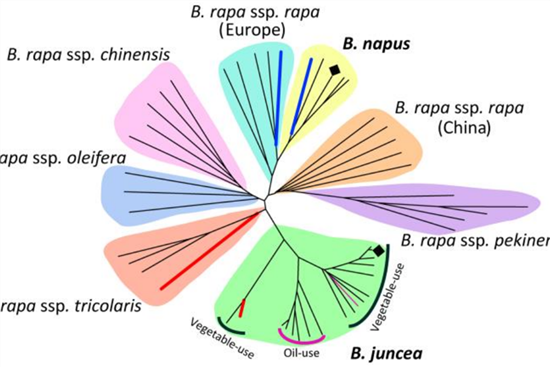 在该研究中,王晓武团队负责完成了黑芥B基因组的测序,以及芥菜(AABB)和油菜(AACC)这两个异源四倍体A基因组来源分析的工作;分析发现,芥菜和油菜的A基因组来源不同,芥菜(AABB)的A基因组来源于白菜型油菜,油菜(AACC,C为甘蓝)的A基因组起源于欧洲芜菁。