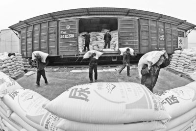 近日,工人在江苏省东海县火车站货场加紧卸载一批到站的春耕化肥。耿玉和 摄
