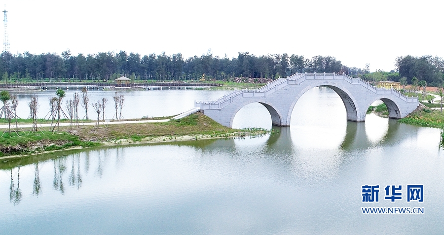 如今湖石淉蜕变成生态湿地公园,新近种植的绿树已经扎根成活(无人机拍摄)。新华网 肖和勇 摄