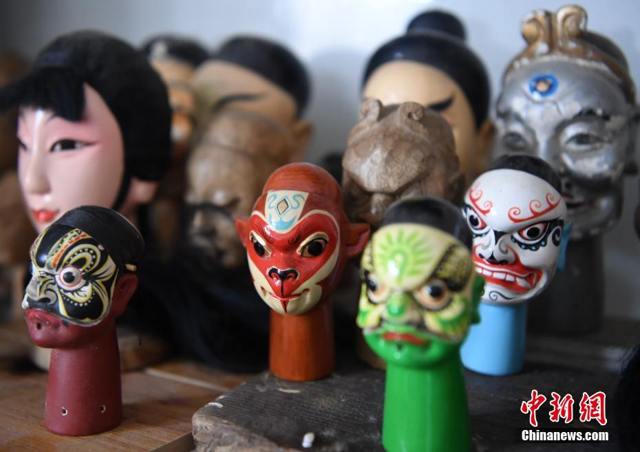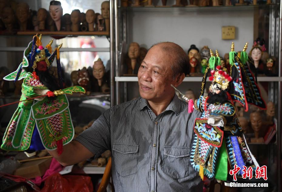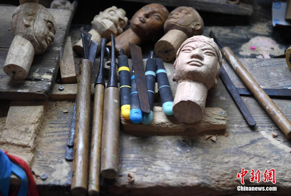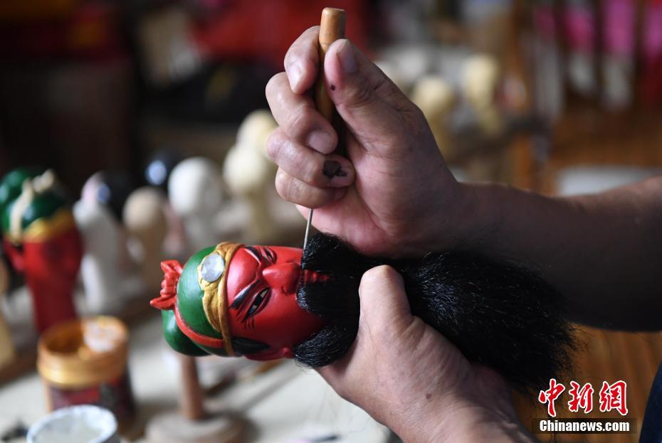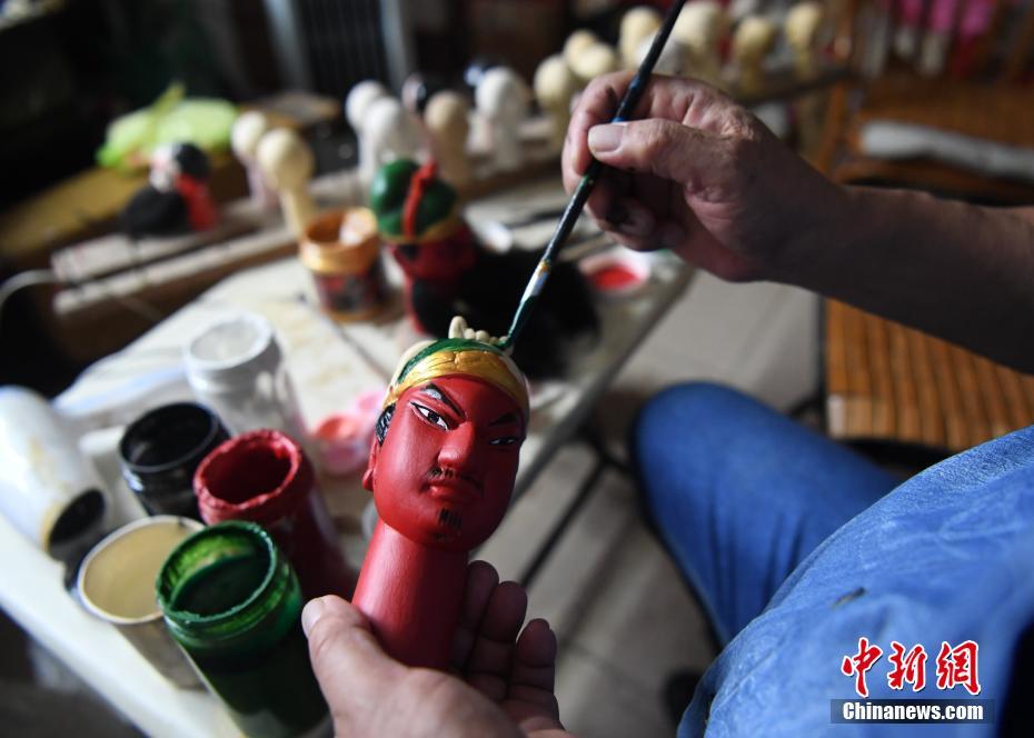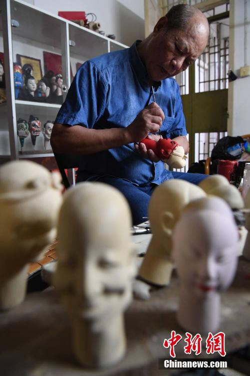 图为杨亚州在其工作室为雕刻的木偶头上色。杨亚州的祖父杨高金为清末“福春派”戏状元,到了杨亚州这一代,他钻研木偶雕刻,姐姐为他的木偶当裁缝,其弟杨辉发扬木偶戏表演技艺。张斌 摄
