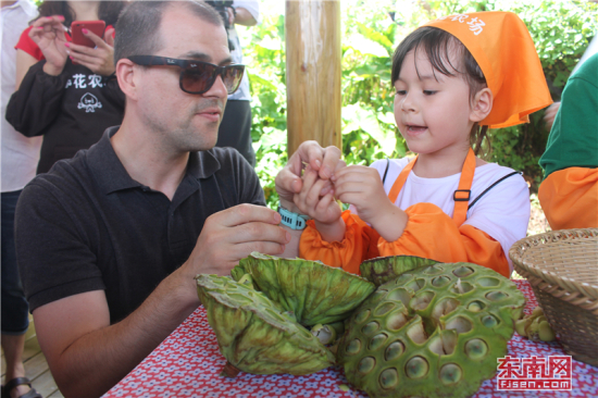 濉溪镇坪上梯田莲海还举办了建宁制莲手工技艺——非物质文化遗产体验展示活动,在现场,看到几名外国游客欢乐地采莲子、剥莲子,来自美国的外语老师Berry告诉,她第一次见到莲花和莲子,通过这次活动真正了解了莲子的制作过程,体会到了中国文化的博大精深。还有数十家亲子家庭参与了采莲、剥莲、制莲,体验展示了省非物质文化遗产——建莲手工加工技艺。来自加拿大的Xavier带着自己10岁的女儿亲自体验了建莲的制作过程,Xavier说:“建宁这里的空气特别好,剥莲子很辛苦,很好玩,莲子很好吃。”