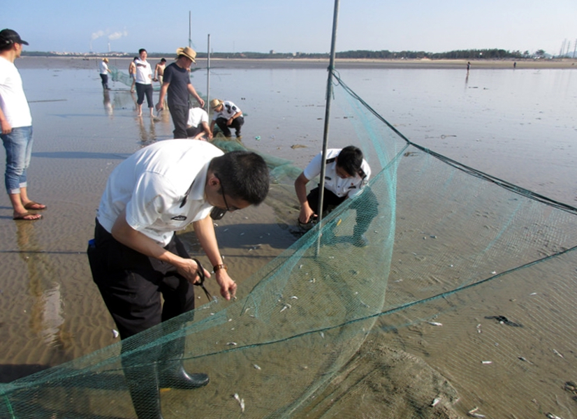 本次行动共出动执法人员11名,对大厦村浅海滩涂违规布设的400米樯张网违规网具进行强制拆除。