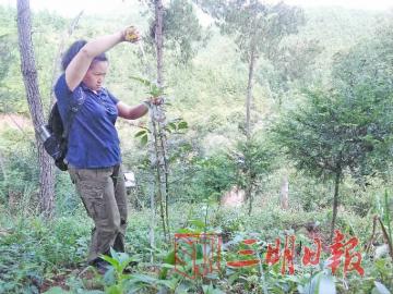 明溪县在针叶林下套种鄂西红豆树,一年生幼树平均高度达到一点五三米,地径二点六厘米,成活率百分之九十九点六。经中国林业科学研究院亚热带林业研究所专家确认,这一林下套种鄂西红豆树技术,在全国处于领先地位。这片幼林位于明溪县东部,为南方红豆杉与鄂西红豆树混交种子园,其中鄂西红豆树四十一个家系,总面积一百零五亩,由全国科普带头人余能健负责技术攻关和指导。据余能健介绍,鄂西红豆树是红豆树的一个珍稀品种,同为豆科常绿乔木,干形通直,木材坚硬,纹理细致,心材耐腐,素有“中国桃花心木”之美誉,被列入国家二级重点保护植物。图为八月十五日,科研人员在测量鄂西红豆树生长情况。