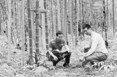 范小明(左)到四都镇溪口村指导林农种植技术。