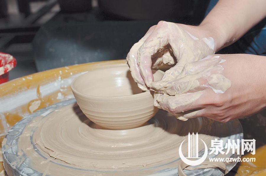 手拉坯,泥土在指尖转动成型。