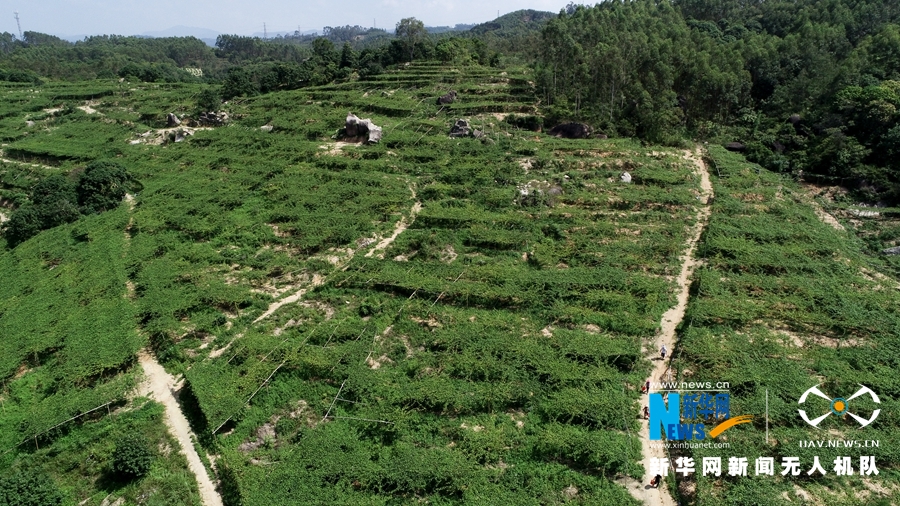 这是无人机拍摄到的黄金百香果果园,农户正在采摘果实。新华网 肖和勇 摄