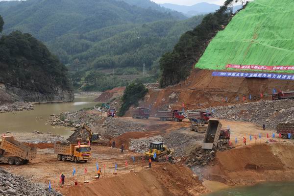 10月26日上午11时,随着一车车土石倾倒入霍口水库大坝上游围堰预留的龙口处,福建敖江流域最大的水利枢纽工程成功截流, 正式进入大坝主体工程建设阶段。