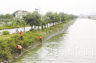 图为河道专管员蔡秋灵与保洁员一道清理河道垃圾。