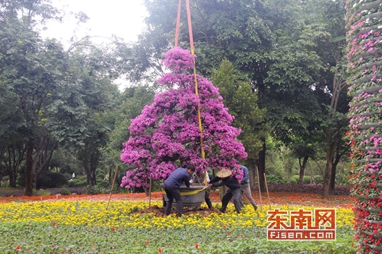 工人正在摆放三角梅