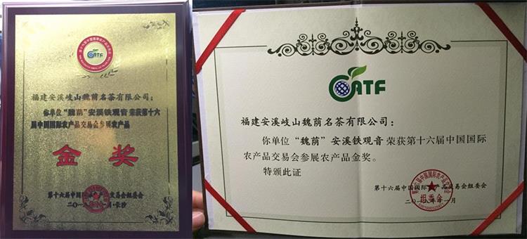 安溪铁观音(魏荫茶业)作为农产品地理标志展区唯一代表参加总结颁奖大会。总结大会上,福建安溪岐山魏荫名茶有限公司参展的“魏荫”安溪铁观音荣获第十六届中国国际农产品交易会金奖。