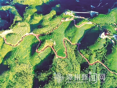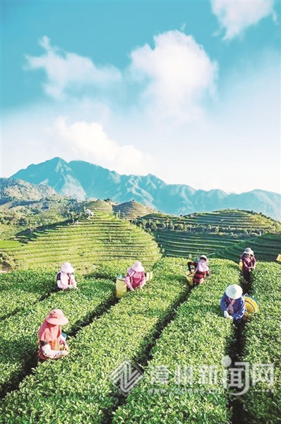 “生态+产业”让原有茶场焕发生机。立冬已过,闽南进入秋茶采摘季,漳州平和县高峰谷生态茶园里,1000多亩梯田茶园绿意绵延,犹如一枚枚“大地的指纹”。身着各色服饰的采茶女穿梭其间,为高峰谷景区增添一道亮丽的风景。