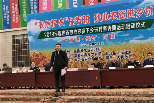 当前,正值春季农业生产关键时节,全省各市、县、区已陆续进入春耕备耕时期,农资产品逐渐进入销售、使用旺季。根据《福建省农业农村厅关于认真开展2019年放心农资下乡进村宣传周活动的通知》(闽农综明传[2019]47号)文件要求,2019年2月26日,主题为“农盾护农保春耕、放心农资进乡村”的“2019年福建省放心农资下乡进村宣传周”活动启动仪式在长汀县河田镇成功举办。