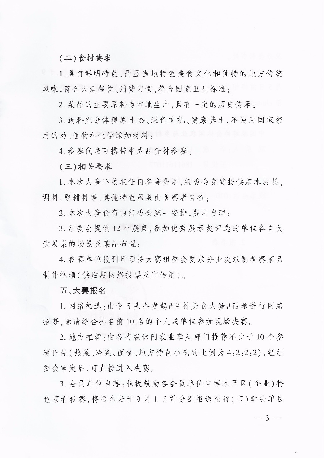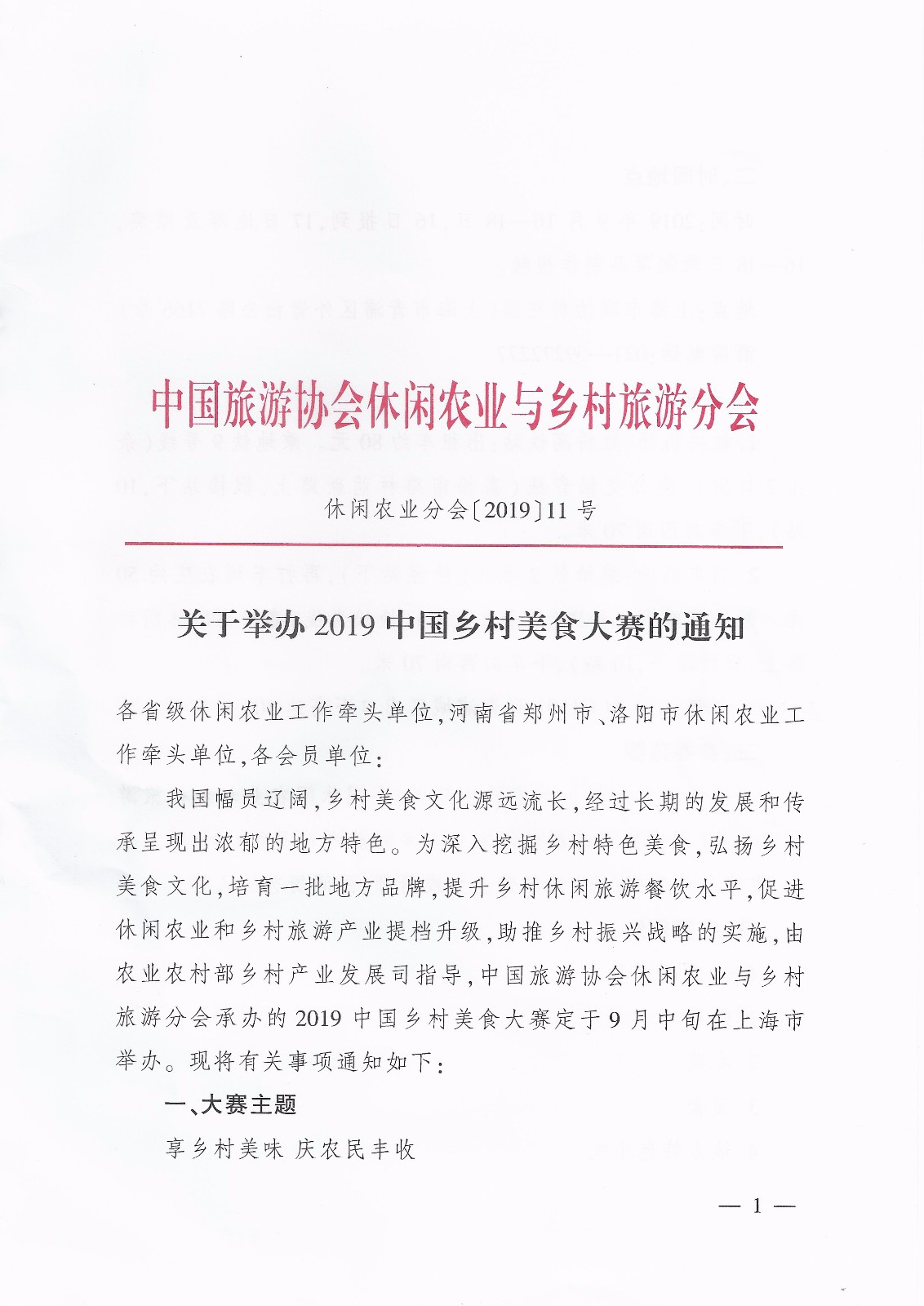 按照《关于举办2019中国乡村美食大赛的通知》(休闲农业分会〔2019〕11 号)要求,为深入挖掘乡村特色美食,弘扬乡村美食文化,培育一批地方品牌,提升乡村休闲旅游餐饮水平,促进休闲农业和乡村旅游产业提档升级,农业农村部乡村产业发展司与中国旅游协会休闲农业与乡村旅游分会定于9月16—18日在上海市举办2019中国乡村美食大赛。福建省启承三农文化发展中心受分会授权委托,联合福建省美丽乡村发展促进会牵头开展2019中国乡村美食大赛相关工作,共同推动福建省乡村振兴战略的实施。请我省休闲农业与乡村旅游四星级(含)以上企业、农家乐经营户(点)的经营业主或厨师、民间厨艺达人积极报名参与,并于2019年8月31日前将报名表提交至福建省启承三农文化发展中心。