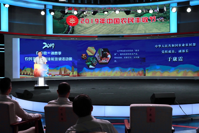 8月23日,农业农村部、中国农民丰收节组织指导委员会在京举办2019“庆丰收·消费季”和农民手机应用技能培训启动仪式。农业农村部副部长于康震出席启动仪式并强调,要深入贯彻党中央、国务院部署,扎实做好2019年中国农民丰收节系列活动。要坚持让利农民、惠及市民,同庆丰收、共享丰收,将“庆丰收·消费季”和农民手机应用技能培训办成让广大农民受益的好事实事,用信息化手段助力产销对接,让农产品“卖的出,卖得好,卖出好价钱”。