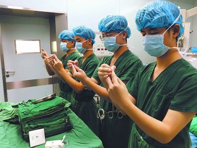 就读福建卫生职业技术学院三年制中职护理专业委培班的贫困家庭学子们,在手术室里练习穿针。 吴恩儿 摄