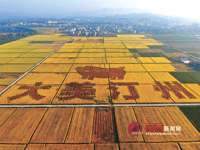 长汀县农业农村局实施的“2019年河田镇农业部水稻绿色高质高产高效创建万亩示范田”晚稻喜获丰收,正进入机械化收割。该示范片包括上街、中街、下街、南塘、朱溪、下修、窑下等6个村,总共11500亩,选用优质稻品尝,采用工厂化育秧、全程机械化耕作、测土配方施肥、绿色防控病虫害等技术,晚稻有望达到每亩480公斤产量目标。图为昨日示范片河田镇上街村五彩稻图案无人机航拍。
