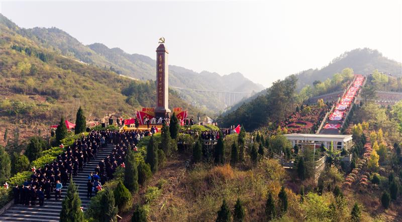 “1935年1月,敌人占领了营棚顶高地。伏击战变成了仰攻战。战士冲上去、干部团也冲上去,朱德把帽子一甩,“得了,老伙计,不要光考虑我的安全,只要红军能胜利,区区一个朱德死何足惜……”站在青杠坡红军烈士纪念碑前,脚下就是三千烈士鲜血染红的沃土,听着讲解员诉说青杠坡战役的故事,仿佛烈士冲锋的身影和战役的场景就在大山的天空中重现。