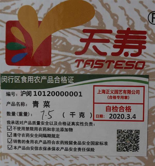 3月4日,上海市闵行区正义园艺场为生产的青菜开具了“闵行区食用农产品合格证”,成为上海市第一张食用农产品合格证。