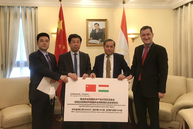 4月7日,我国向塔吉克斯坦农业部捐赠医疗物资交接仪式在塔驻华使馆举办。塔方和上合组织高度赞赏中方防控疫情举措,感谢中国农业农村部和杨凌示范区的真诚帮助,愿与中方深化农业合作,共同推动构建人类命运共同体。