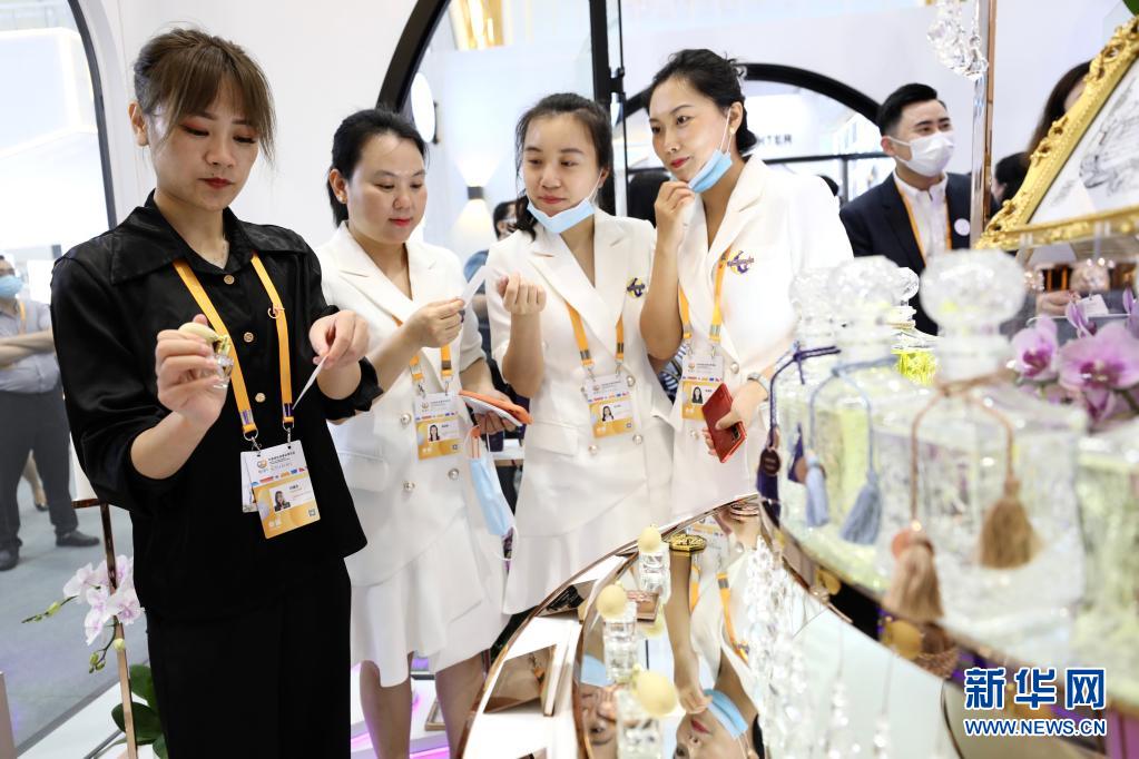 5月7日,在海南国际会议展览中心时尚生活展区,参观者在试用香水。