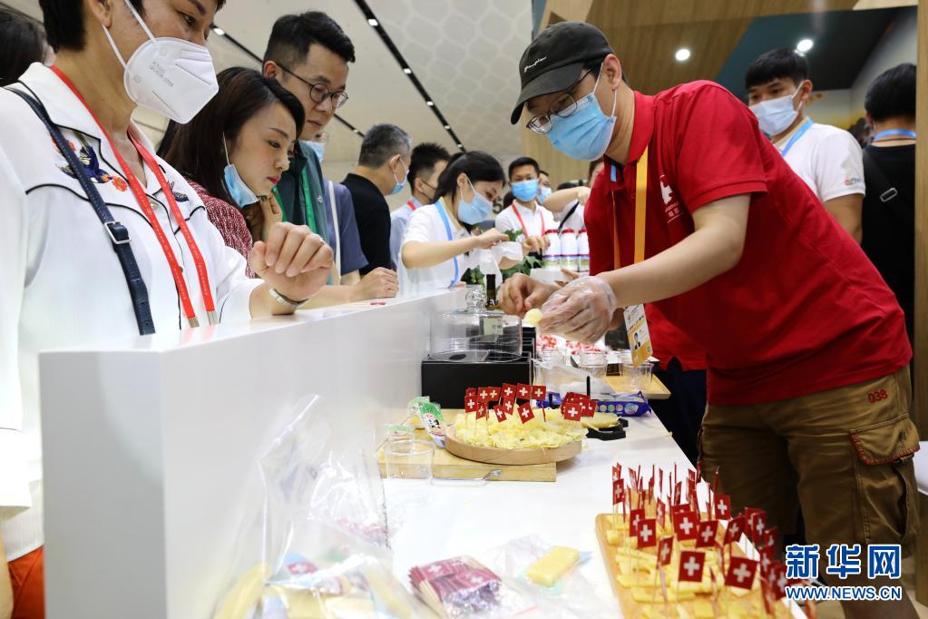 5月7日,在海南国际会议展览中心时尚生活展区,参观者排队体验来自瑞士的奶酪。