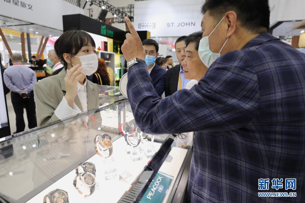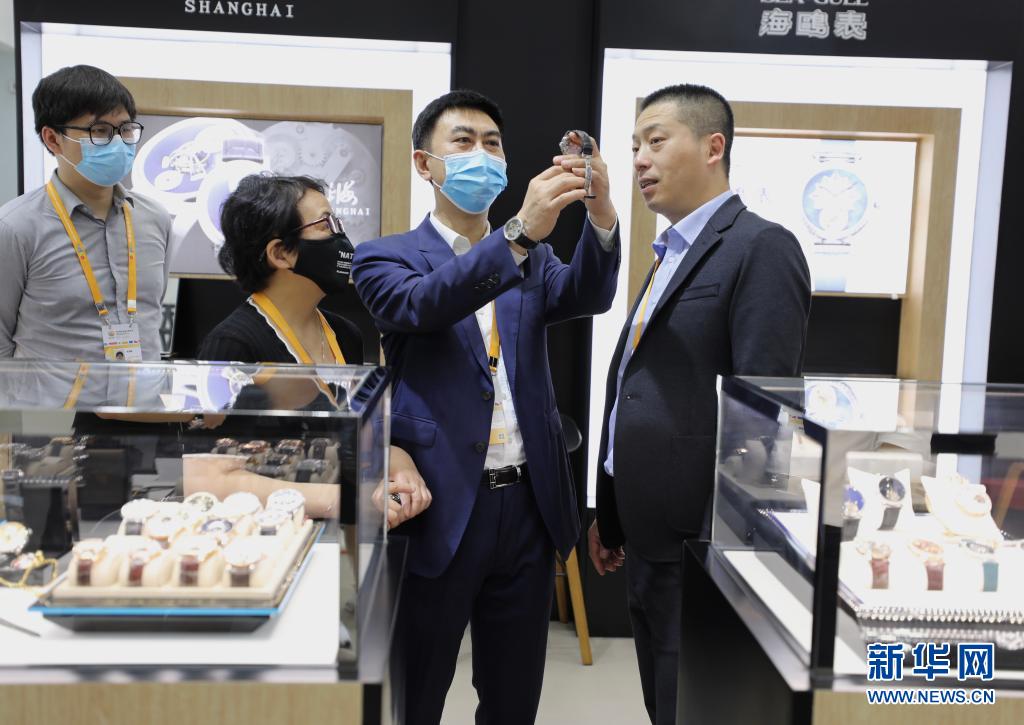 5月7日,参观者在海南国际会议展览中心时尚生活展区了解上海、海鸥、孔雀等国产手表。