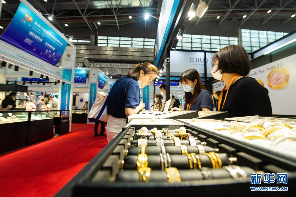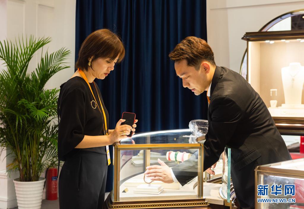 5月7日,参观者在海南国际会议展览中心珠宝展区了解参展商品。