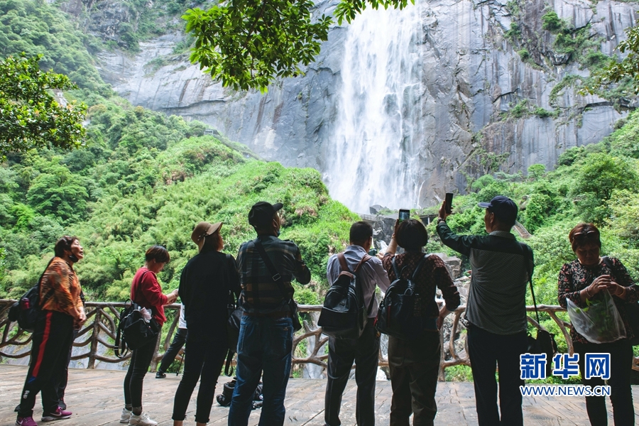 游客在德化县石牛山景区岱仙瀑布前观光拍照。新华网发(连江水 摄)