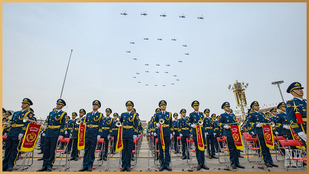 △29架直升机组成“100”字样掠过长空。(总台廖江衡拍摄)