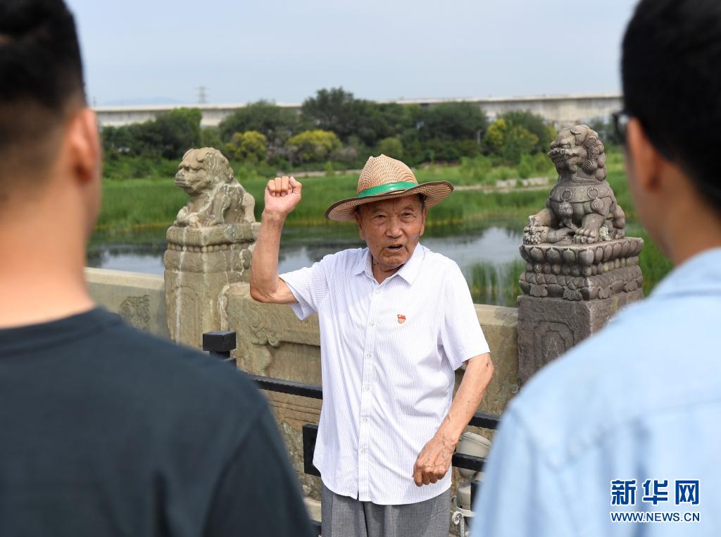 7月5日,郑福来老人在北京卢沟桥为游客讲述抗战历史。新华社 张晨霖 摄