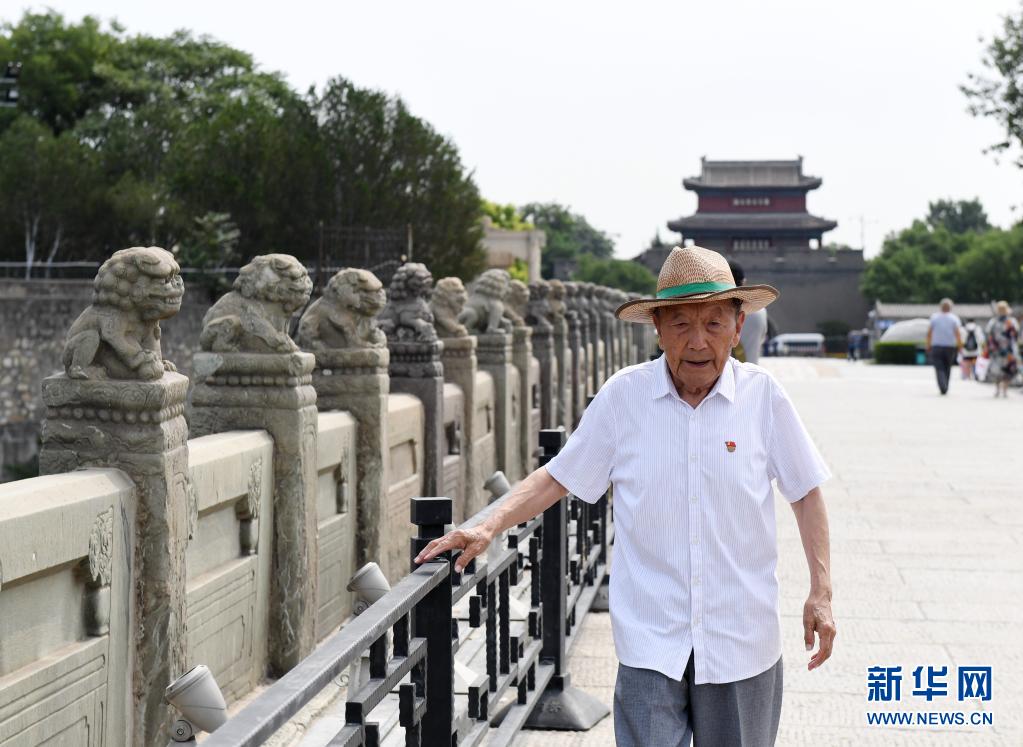 7月5日,郑福来老人走在北京卢沟桥上。新华社 张晨霖 摄