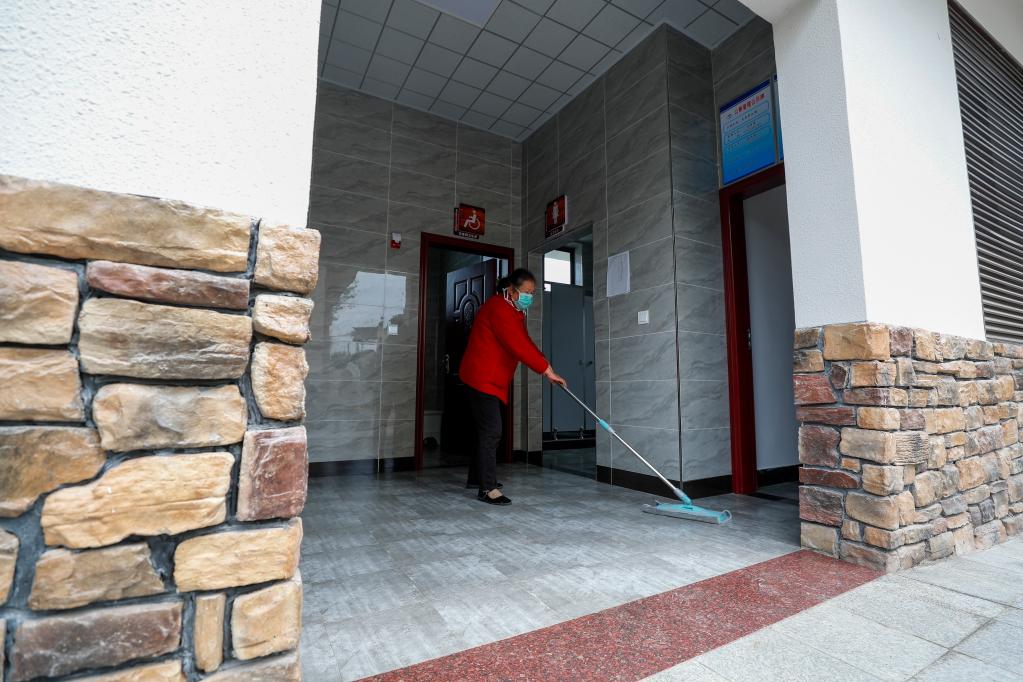 2020年4月8日,重庆市沙坪坝区中梁镇龙泉村村民吴桂慧在打扫村里的公厕。 新华社发(黄伟 摄)