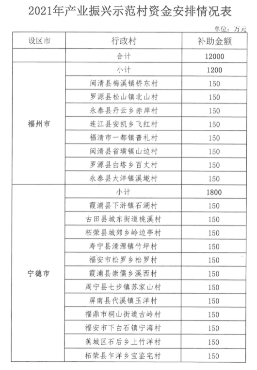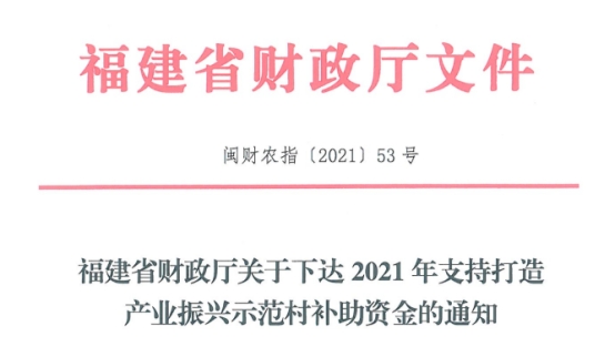 近日,福建省财政厅印发《关于下达2021年支持打造产业振兴示范村补助资金的通知》(以下简称“《通知》”),下达产业振兴示范村补助资金12000万元,推动乡村产业振兴,推动村集体经济收入和农民收入稳定增长,促进农业高质高效、乡村宜居宜业、农民富裕富足。