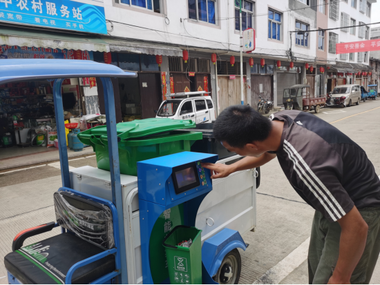 每天清晨,宅中乡专职垃圾分类员就会驾驶智能小型垃圾回收车沿着线路逐门逐户进行垃圾收集,村民只需将带有芯片的干湿二分桶放置在称重处,车载“智慧系统”就会自动称重,并将村民垃圾分类情况、重量等数据传送至宅中乡积分平台进行记录、汇总,积分可兑换纸巾、毛巾、牙刷等小商品。
