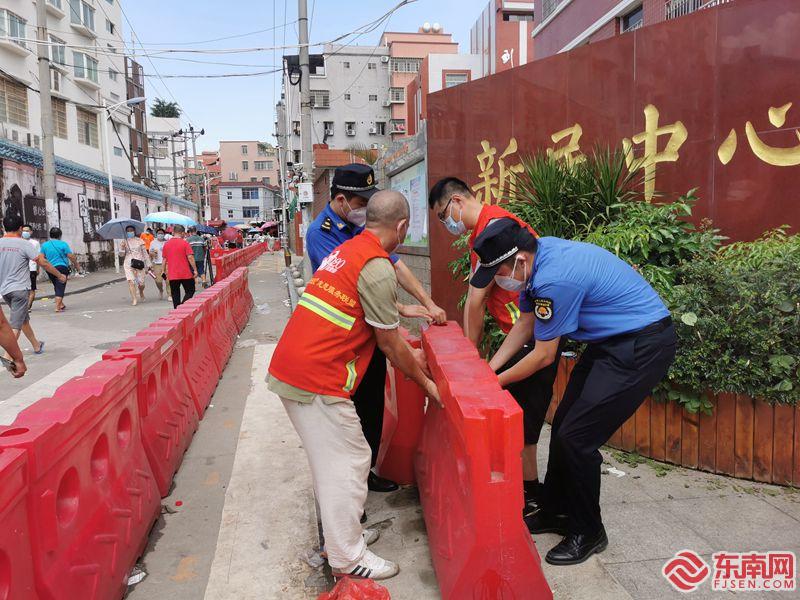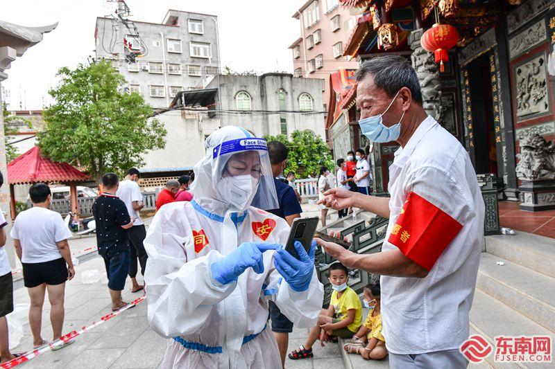 14日,在厦门市同安区新民中心小学核酸检测点,市民群众在志愿者的引导下,有序地进行检测。