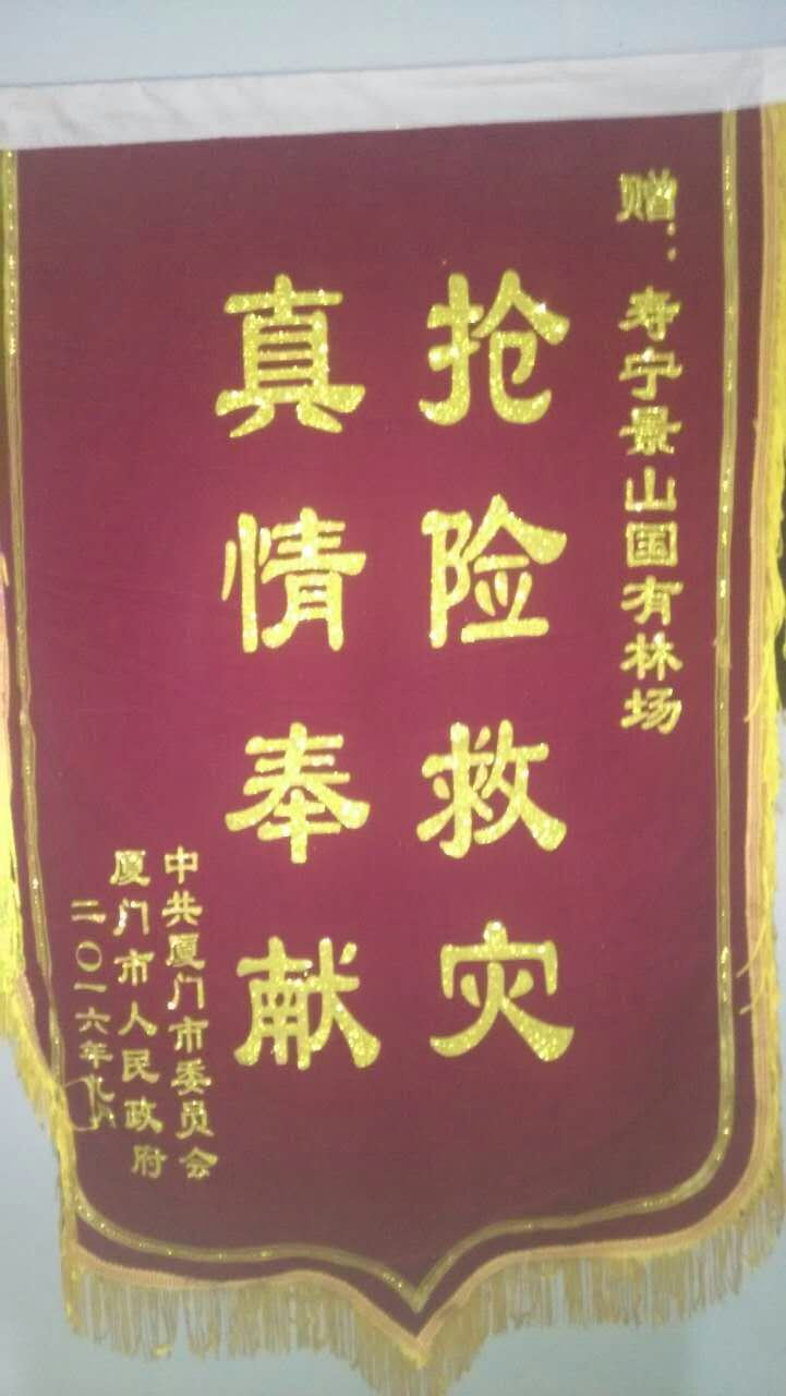 救援工作期间,宁德市国有林场救援队除了与当地群众结下了很深的情谊外,其高效工作效率以及兢兢业业的奋斗精神还得到当地政府的高度认可,救援队返程的当天,厦门市委市政府赠与宁德市林业局、寿宁景山国有林场“抢修救灾、真情奉献”的锦旗。