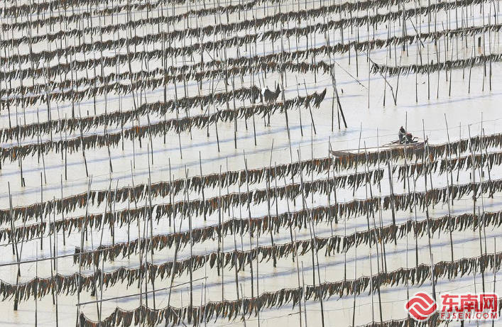 5日,在霞浦县沙江镇沙江村海面上,养殖户利用晴好天气抓紧时间收获海带。据了解,霞浦是“中国海带之乡”,去年全县产鲜海带150余万吨,产值达16亿元,从事海带养殖、育苗、加工与流通的人员约10万人,惠及人口20多万人,已成为沿海群众经济收入的主要来源之一。