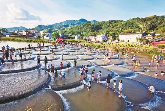 事实上,建设鱼鳞坝不是为提供戏水场所,它原是河岸边联春楼红色教育基地的一个配套设施,也是一个农村给水设施,主要用于巩固坝头,保护农田。在新媒体的传播下,鱼鳞坝成了一个“网红”戏水点。鱼鳞坝不仅带火了周边联春楼、畲族古村坪水村、九且溪等景点,还带火了邦都村的民宿。