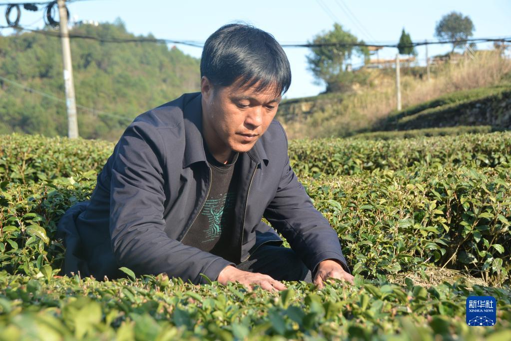 高清根在自家茶园内检查茶树生长情况。新华社记者颜之宏 摄