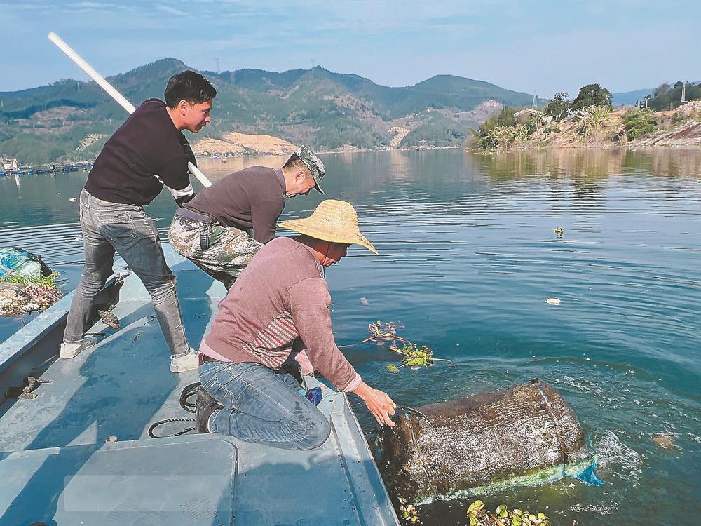 为加强闽江水口水库水环境保护,维护闽江流域水质,19日,古田县水口镇开展水口库区(水口段)废弃物全面统一执法行动,组织镇、村(社区)干部、执法人员清理废弃走道51个1350米、非法网箱29个、废弃锚绳625条、水葫芦18吨。图为工作人员在清理江面废弃物。