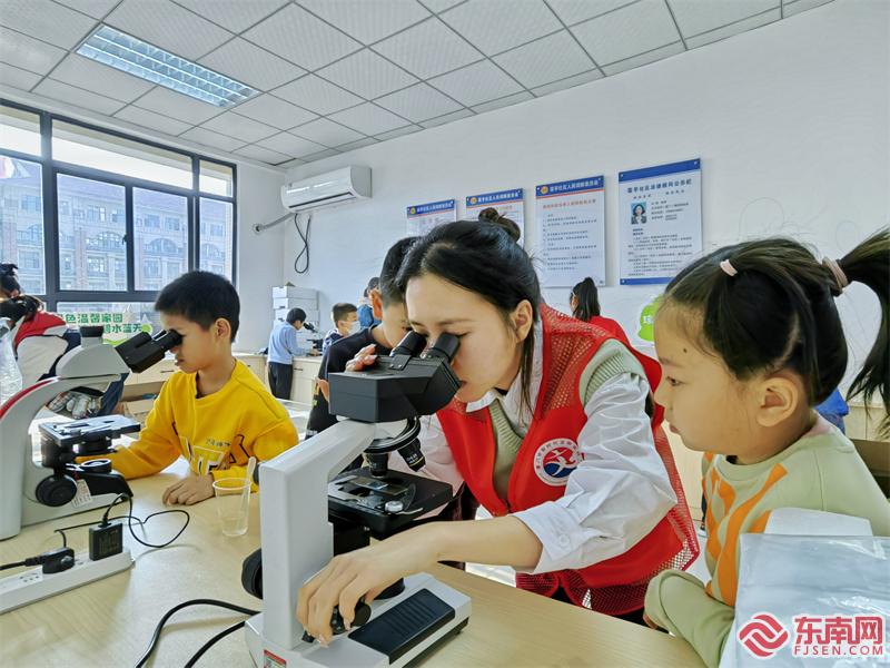 华侨大学志愿者帮莲亭社区孩子们调试显微镜(李海青 摄)