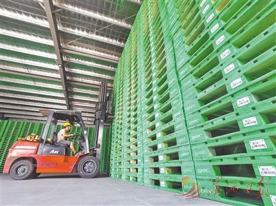 “与传统木托盘不同,我们的托盘通过植入芯片,有助于实现物资全流程智能管理。”该园区托盘生产负责人凡寿龙带着记者来到仓库,这里数万个托盘犹如大厦般整齐码放,每个托盘都被喷涂成绿色,托盘侧面用螺丝固定着一片白色塑料片,上面印有中林集团标志和条形码,这便是中林集团数字化木托盘智能芯片。该芯片采用射频识别技术,托盘只要进出仓库,就可实现非接触双向数据通信,极大提高仓库管理效率,提升搬运装车速度,降低物流运输成本。作为林业行业唯一中央企业和国家生态产业建设主力军,中林集团围绕“实现木托盘循环共享,推动绿色低碳产业发展”目标,以福州国林林产品有限公司作为木托盘项目实施主体,以福建省国林木材产业园有限公司为生产主体,以中林载具(福建)运营管理有限公司为运营主体,打造木托盘产业基地,发展“木托盘上的固碳经济”。现阶段木托盘月产能最多30万片,未来规划月产能200万片,年产值30亿元。