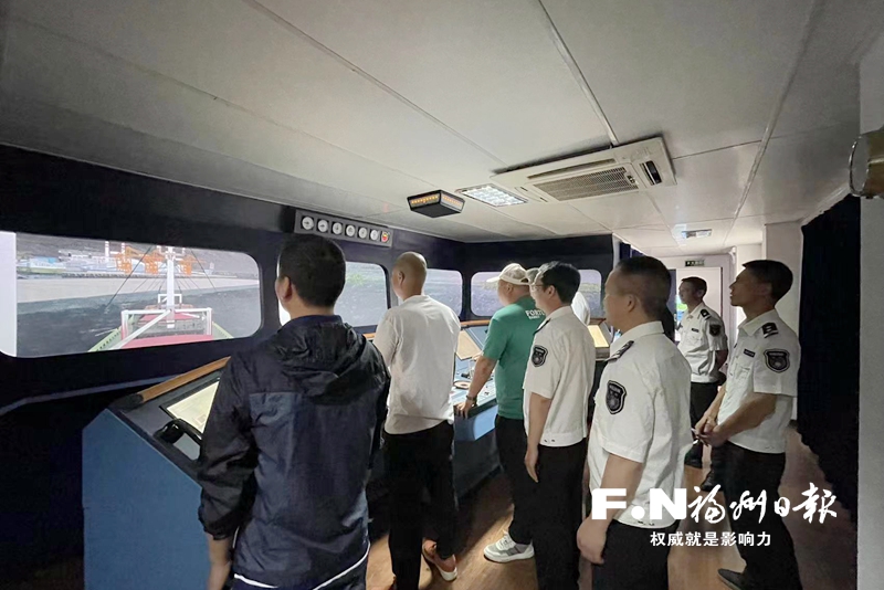 渔船船长通过模拟驾驶台,体验商船驾驶。(市海洋与渔业执法支队供图)