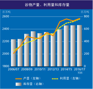 粮农组织对2017年度末全球谷物库存量的预报数提高了250万吨,达到近6.62亿吨,比已经处于高位的期初库存水平提高0.6%,再创记录。这次调整反映了本月小麦生产前景改善以及粗粮利用量从10月份报告的水平上少量下调。据最新预报,2016/17年世界谷物库存量与利用量之比将为25.3%,大大高于2007/08年出现的20.5%的历史最低水平,但要比30年前(1986/87年)创下的35.6%的记录低得多。2016/17年全球小麦库存估计将增加4%(900万吨),达到2.35亿吨,其中大部分增长出现在中国、美国和俄罗斯联邦。相反,世界粗粮库存量现预测为近2.57亿吨,比其期初水平低1.7%(430万吨),中国、巴西和南非的下降完全抵消了其他一些国家尤其美国出现的增长。2016/17年度末世界大米库存量同样预报将下降,但仅仅微弱下降,降至1.699亿吨,因为预期印度和泰国动用库存出现的下降,将基本上为其他国家尤其是中国库存的积累所抵消。
